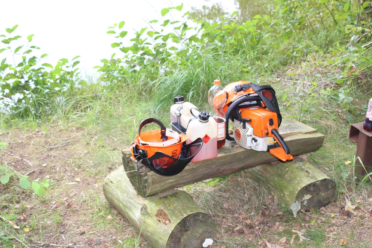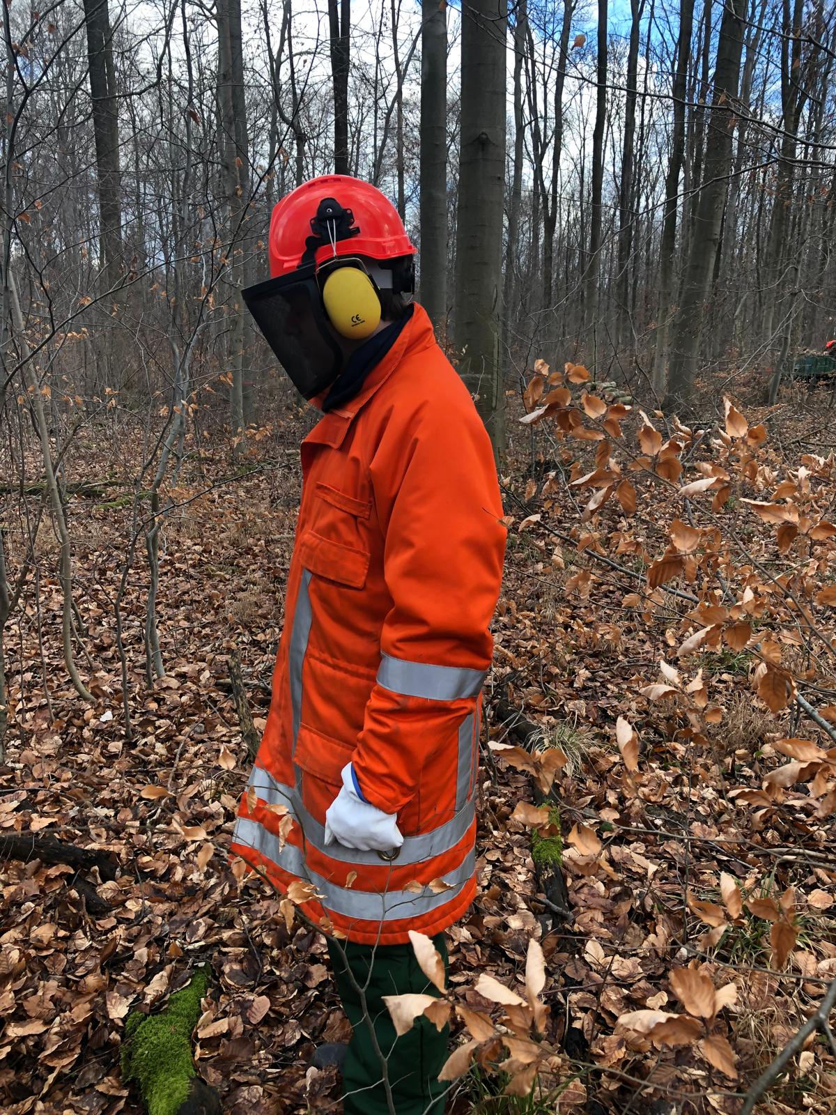 - Vollständige Schutzausrüstung, Schutzhelm mit Gehör - und Gesichtsschutz, Schutzhandschuhe und Sicherheitsschuhe mit Schnittschutz.